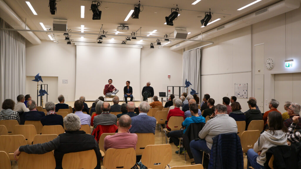 In der anschliessenden Podiumsdiskussion mit Olivier Waldvogel (Suisse eole), moderiert von Celestina Rogers (Pro Wind Nordwestschweiz) wurde klar, dass die Beteiligten ähnliche Interessen haben. Vogelschutz ist wichtig, und Klimawandel bedroht die Biodiversität (also auch die Zugvögel) in bislang ungeahnter Weise.